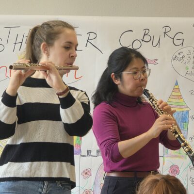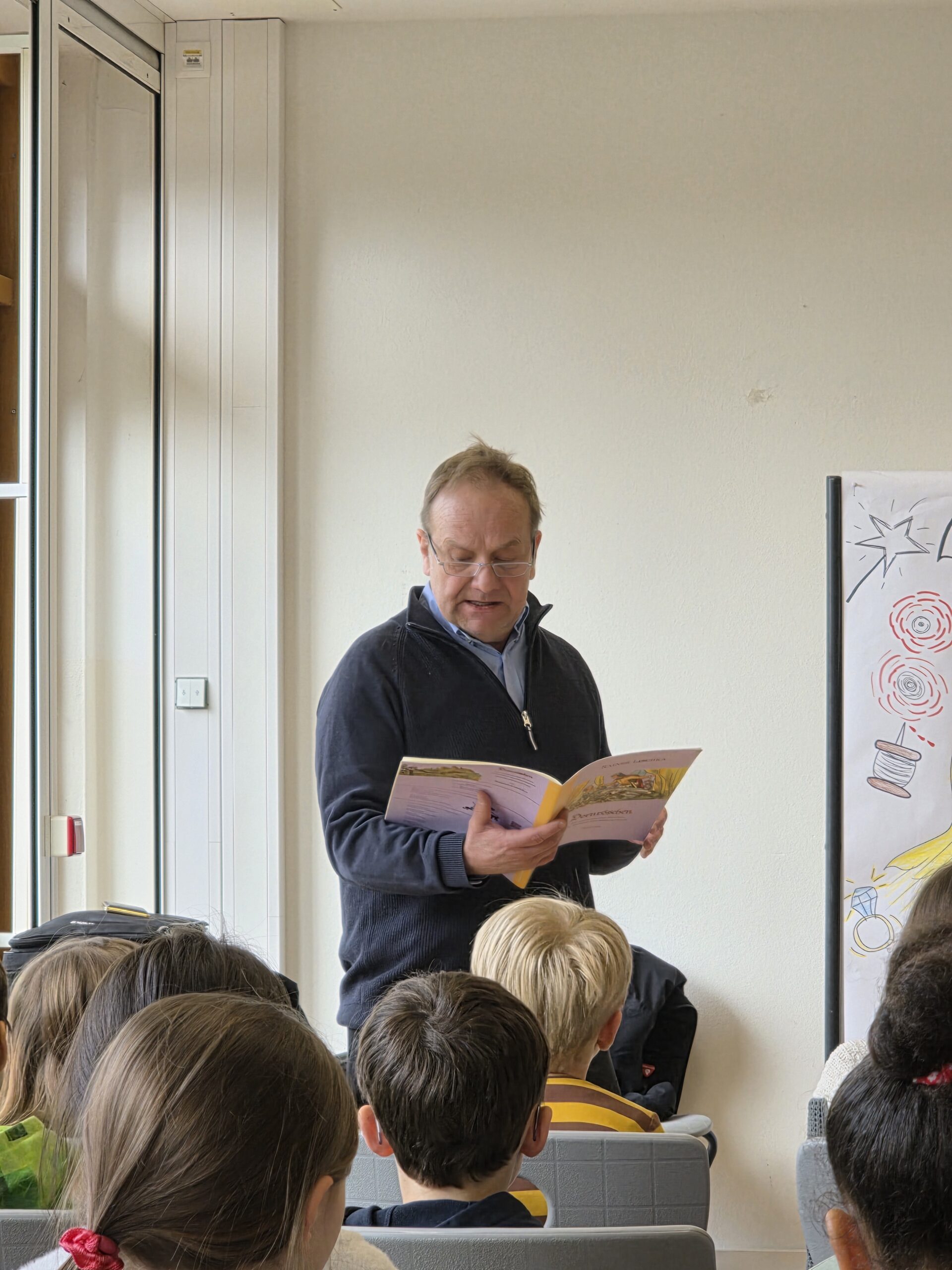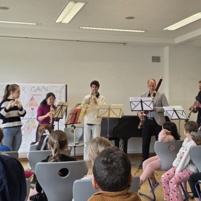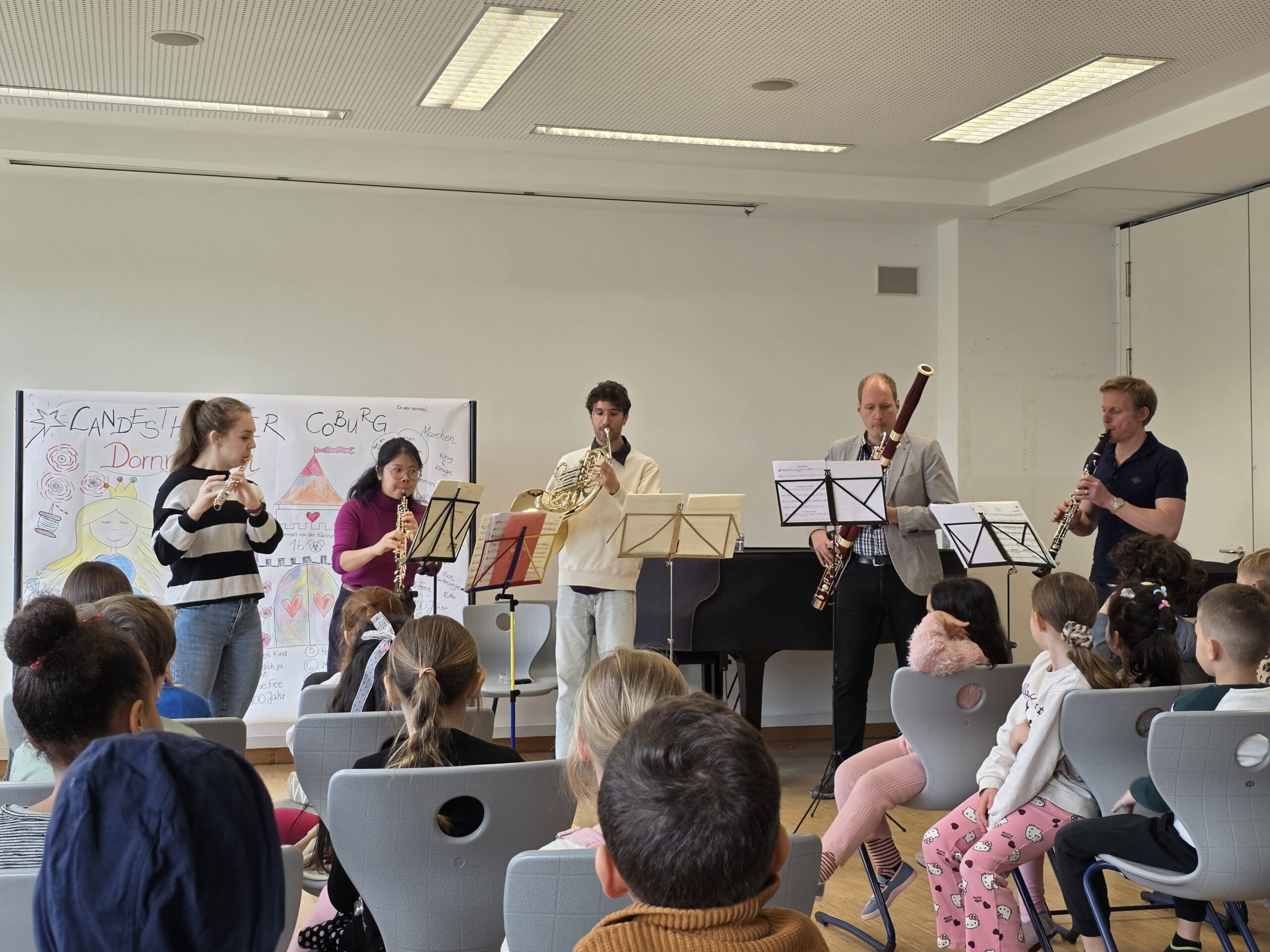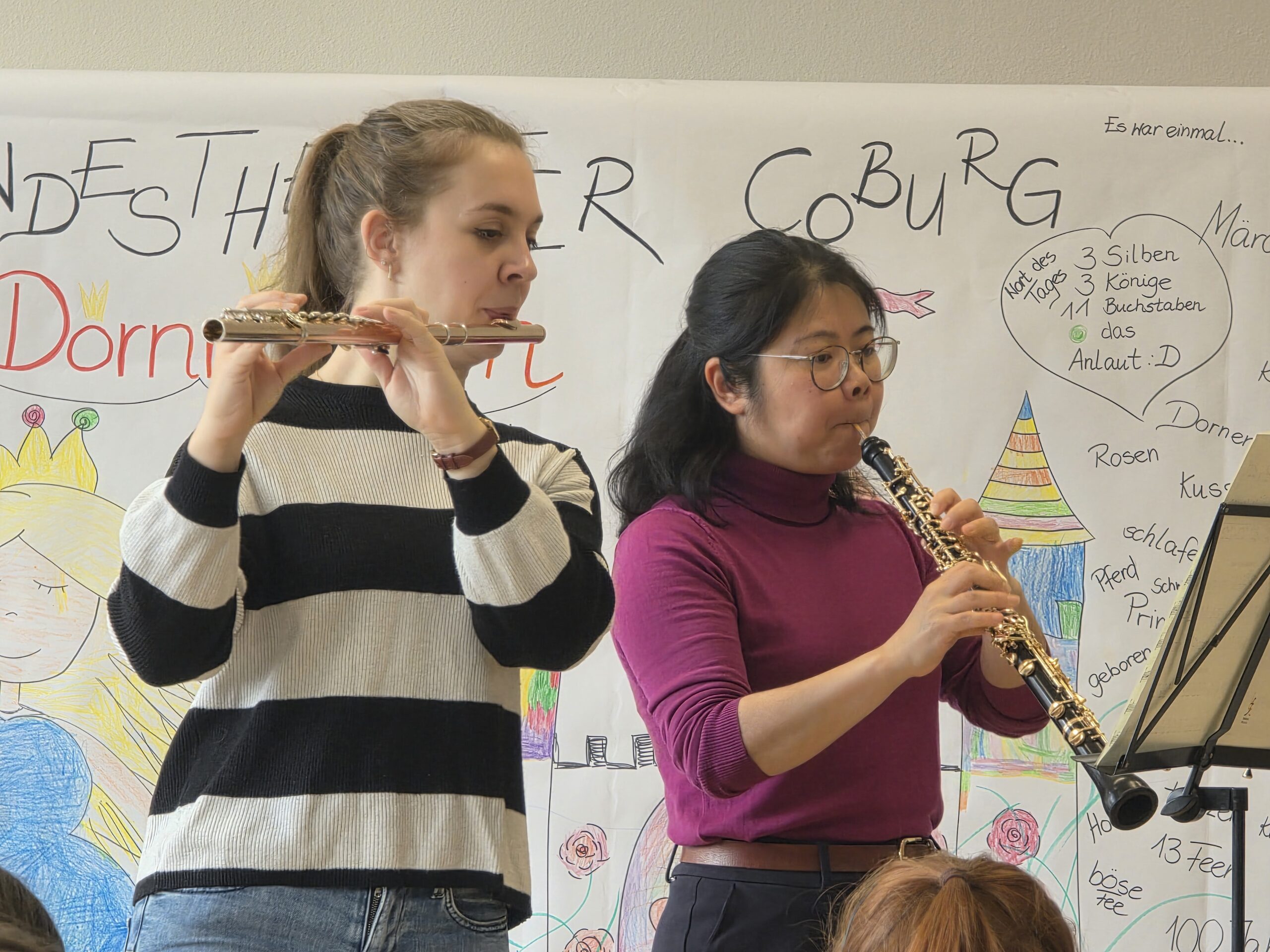 Die Kinder der 1. und 2. Klassen erlebten ein besonderes Märchenkonzert, das von einem Bläserquintett des Philharmonischen Orchesters sowie dem Erzähler Niklaus Scheibli gestaltet wurde. Mit Worten und Klängen, Farben und ganz viel Fantasie wurde die Geschichte lebendig und begeisterte die jungen Zuhörerinnen und Zuhörer. Dabei lernten die Kinder auch die einzelnen Instrumente und ihre besonderen Eigenschaften kennen. Den Abschluss bildete ein gemeinsames Singen des Liedes „Dornröschen war ein schönes Kind“ – ergänzt durch acht weitere Strophen, die für viel Freude und einen stimmungsvollen Ausklang sorgten.